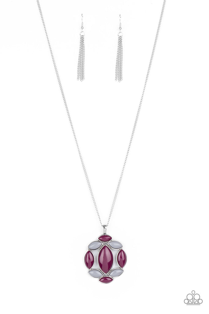 Featuring almond-like shapes, a cluster of polished Magenta Purple and Sleet beads delicately gather into a colorfully whimsical pendant at the bottom of a lengthened silver chain. Features an adjustable clasp closure.