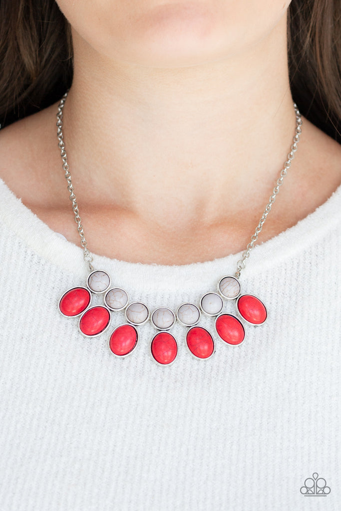 Round gray stone beads connect to oval red stone beads, creating an earthy fringe below the collar for a seasonal look. Features an adjustable clasp closure.