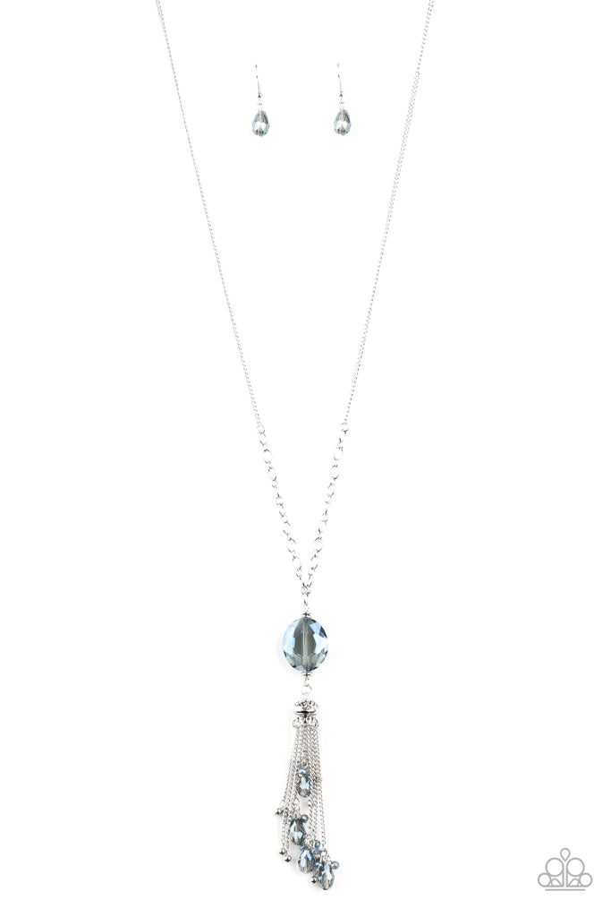 Featuring an iridescent shimmer, a faceted blue gem attaches to the bottom of a lengthened silver chain featuring sections of airy chain links. Infused with dainty silver and matching iridescent beads, shimmery silver chains stream from the bottom of a hematite dotted silver cap, creating an edgy tassel. Features an adjustable clasp closure.