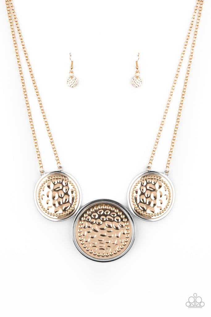 Featuring a warped finish, a trio of hammered and studded silver frames are bordered in gold as they link below the collar for a striking industrial statement. Features an adjustable clasp closure.