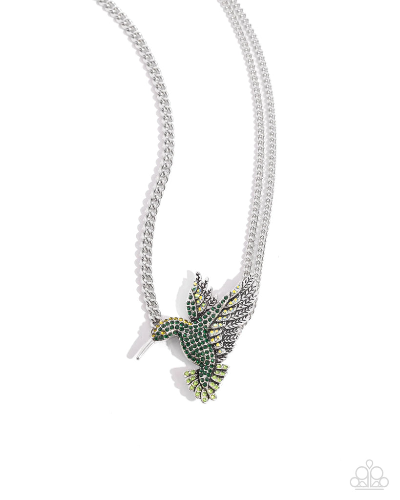 Embellished in green multicolored and green iridescent rhinestones, a textured silver hummingbird pendant flutters below the neckline from a silver chain attached to its head and a double-layered silver chain attached to its wings for a whimsically supported look. Features an adjustable clasp closure. Due to its prismatic palette, color may vary.