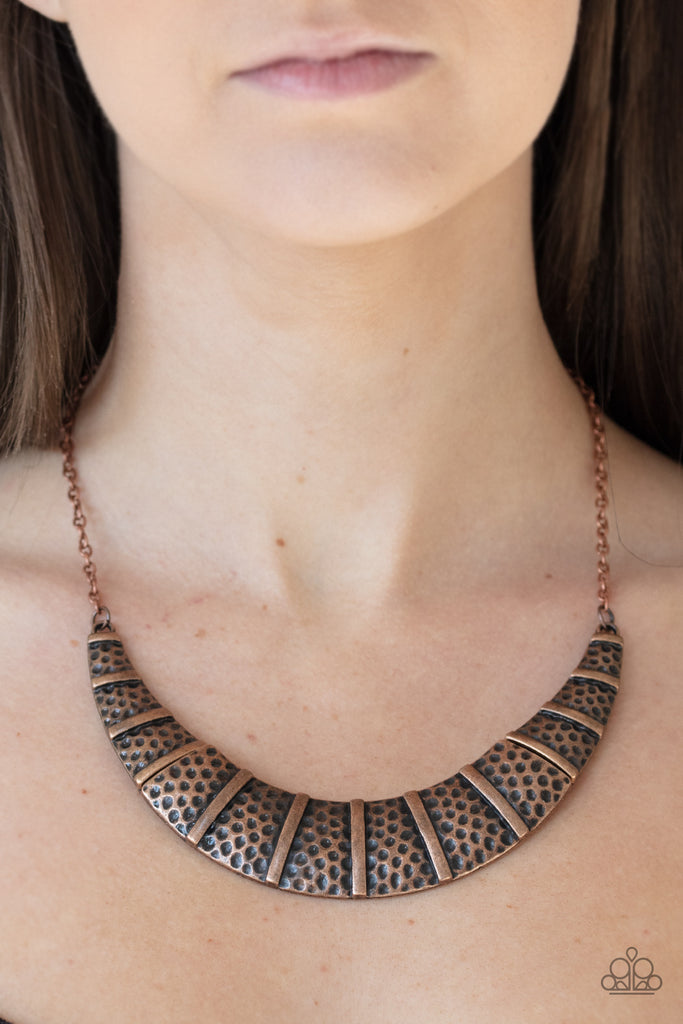 Brushed in an antiqued finish, hammered copper plates link below the collar, creating a bold crescent pendant for a statement-making look. Features an adjustable clasp closure.