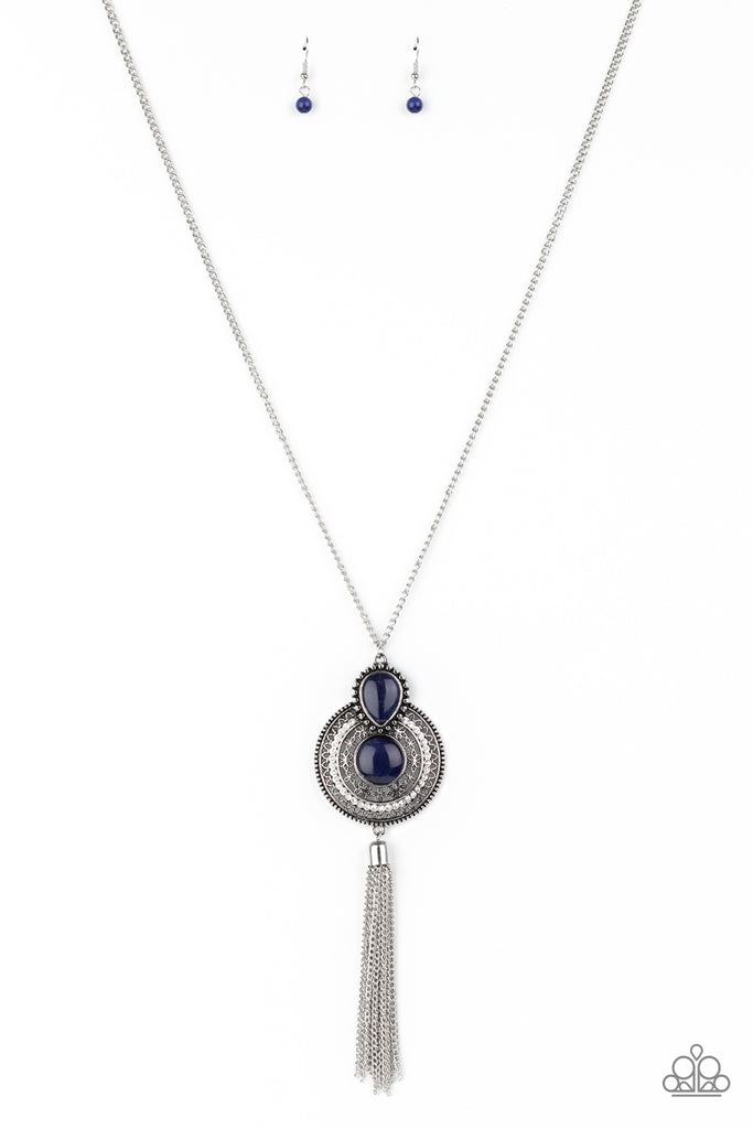 Dotted with a teardrop and round Blue Depths cat's eye stone accents, an ornate silver pendant radiates with glassy white rhinestones and floral filigree at the bottom of a lengthened silver chain. A shimmery silver chain tassel swings from the bottom of the medallion-like pendant, creating whimsical movement. Features an adjustable clasp closure.