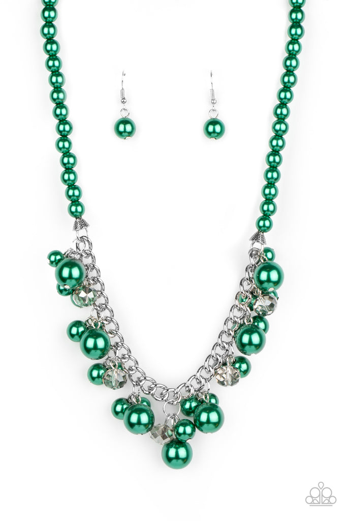 Threaded along an invisible wire, a pearly strand of green beads gives way to a section of chunky silver chain below the collar. Clusters of pearly green beads and smoky metallic-flecked crystals swing from the chain, creating a flawless fringe. Features an adjustable clasp closure.