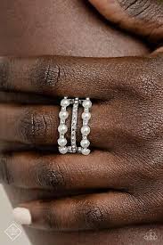 Dainty, bubbly white pearls and glittery white rhinestones are sprinkled across three airy silver bands, creating a refined centerpiece. The centermost band features rhinestones only, drawing the eye to its subtle sparkle. Features a stretchy band for a flexible fit.