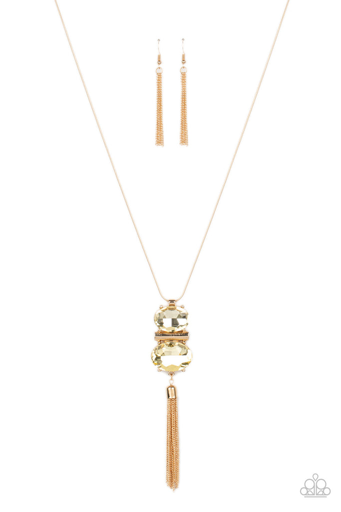 A rectangular gold bar is nestled between two oversized oval yellow rhinestones, creating a stacked pendant at the bottom of a rounded gold snake chain. A shimmery gold chain tassel swings from the bottom, adding whimsical movement to the glittery piece. Features an adjustable clasp closure.
