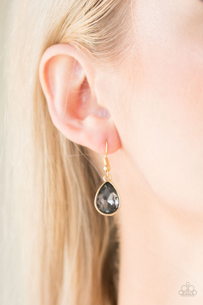 A smoky teardrop gem swings from the bottom of a shimmery gold chain, creating a classic pendant below the collar. Features a toggle closure.