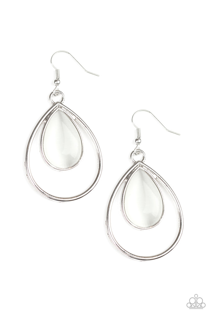 A frosty white cat's eye teardrop stone drips from the top of a shiny silver teardrop frame, creating a whimsical lure. Earring attaches to a standard fishhook fitting.
