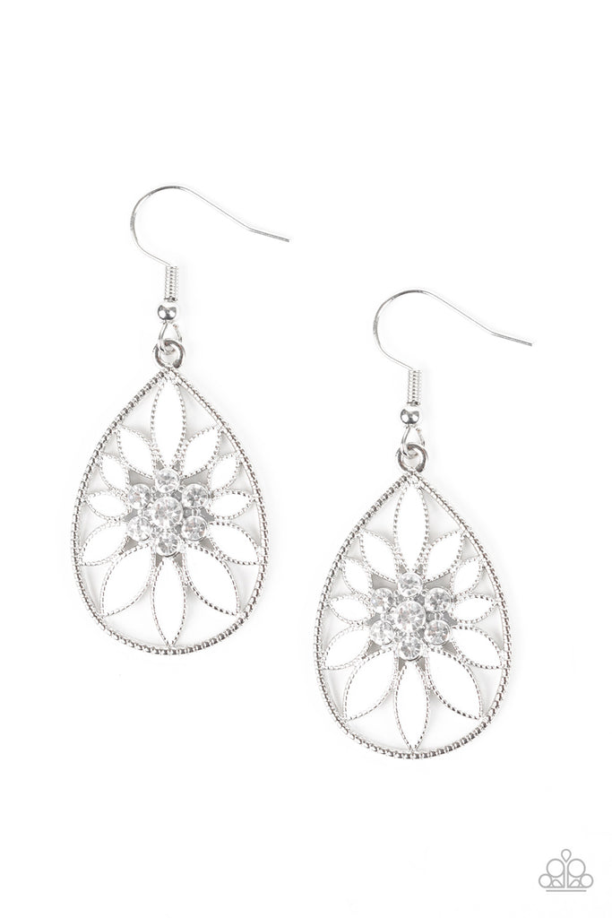 Shiny white petals flare out from a white rhinestone encrusted center, coalescing into a whimsical teardrop frame. Earring attaches to a standard fishhook fitting.