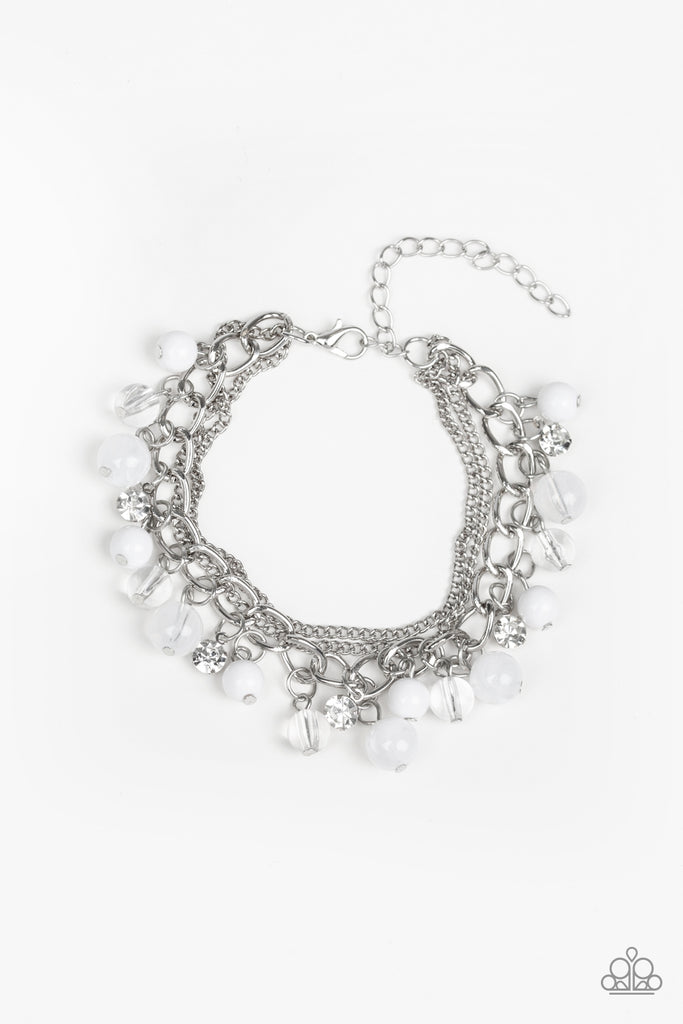 Infused with layers of mismatched silver chains, glassy, polished white, and glittery white rhinestones swing from the wrist in a whimsical fashion. Features an adjustable clasp closure.