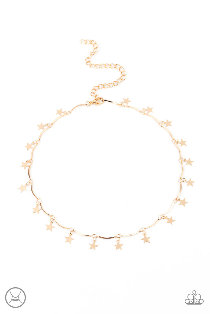 A collection of dainty gold stars and curved gold bars delicately connect around the neck, creating a stellar fringe. Features an adjustable clasp closure.