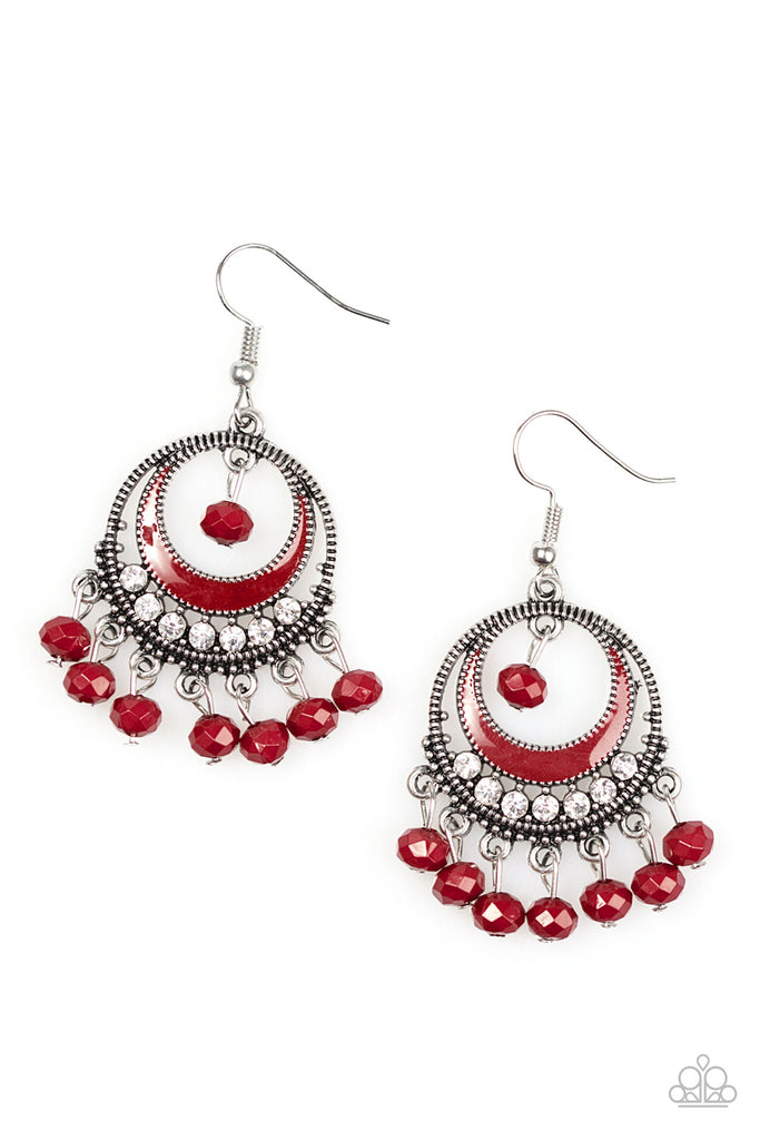 Faceted red beads swing from the bottom of an ornate silver frame, creating a refined fringe. Painted in a shiny red finish, a crescent accent gives way to a row of dazzling white rhinestones for an ornate finish. Earring attaches to a standard fishhook fitting.