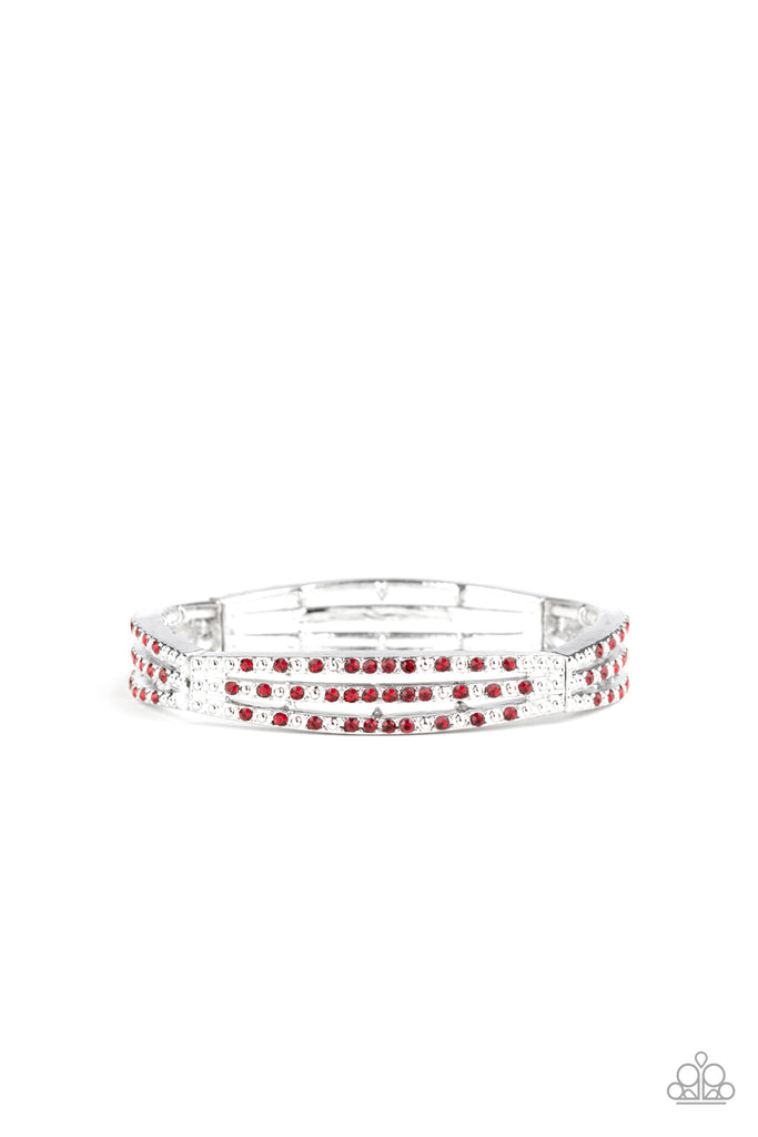 Sporadically dotted in rows of glittery red rhinestones and shiny silver studs, stacked silver frames are threaded along a stretchy band around the wrist for a refined look.
