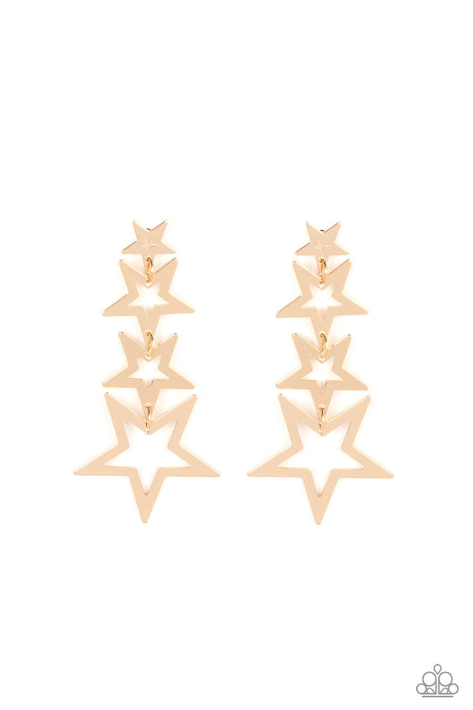 Flat gold star frames gradually increase in size as they delicately link into a stellar tassel, resulting in an out-of-this-world fashion. Earring attaches to a standard post fitting.