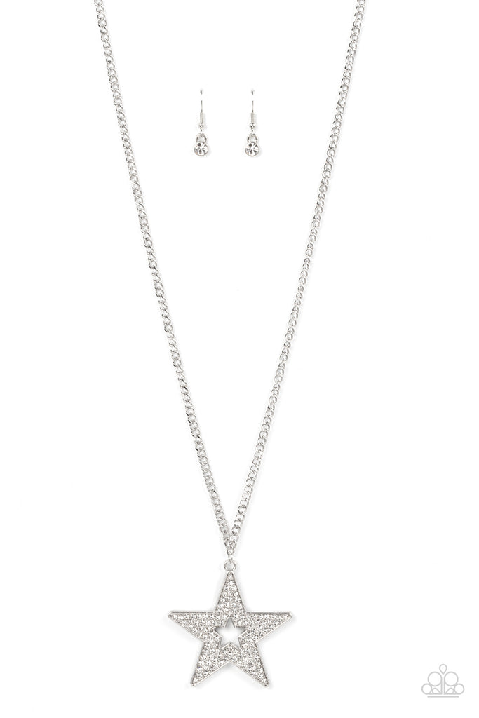 Blinding white rhinestones are encrusted across the front of an oversized silver star frame at the bottom of a lengthened silver chain, resulting in a stellar sparkle. Features an adjustable clasp closure.
