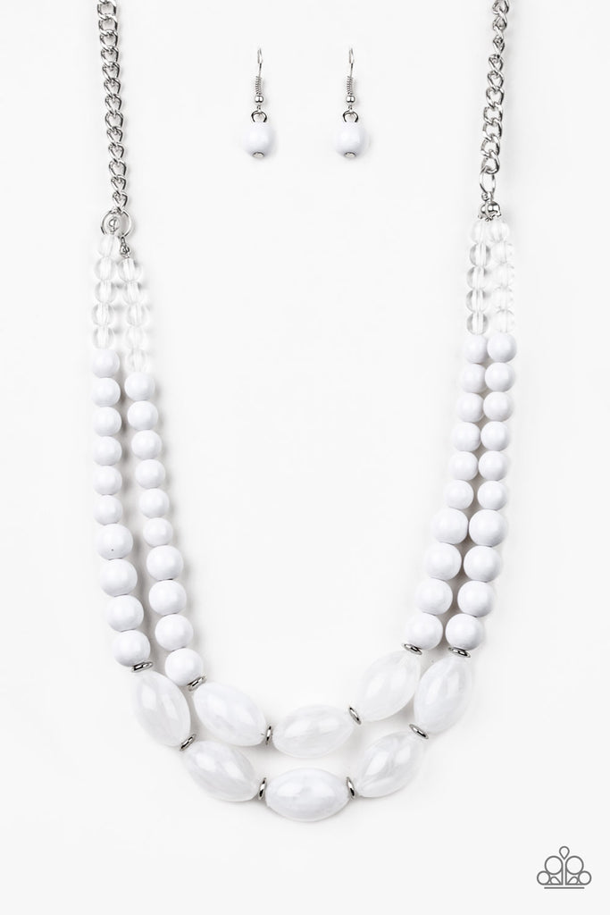 A collection of glassy, polished, and cloudy white beads are threaded along two invisible wires below the collar for a beautiful pop of color. Features an adjustable clasp closure.