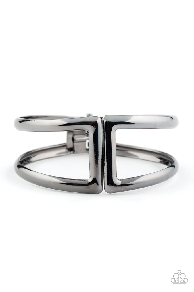 Brushed in a high-sheen shimmer, geometric gunmetal frames curl around the wrist, creating a tribal inspired cuff. Features a hinged closure.