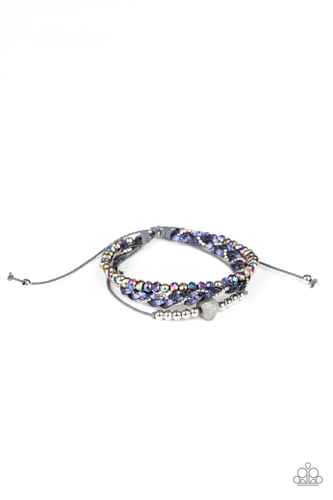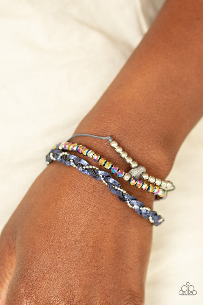 A collection of braided metallic blue leather, iridescent metallic beading, and shimmery silver accents layer across the wrist for a retro urban look. Features an adjustable sliding knot closure.