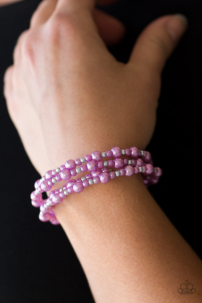 Varying in size, dainty purple pearls and shimmery silver beads are threaded along a long wire to create an infinity wrap bracelet. Coil design allows for an adjustable fit.