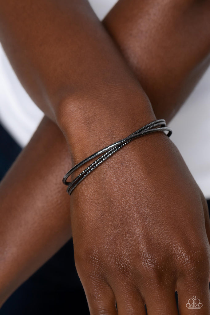 One strand of glittery gunmetal and one double strand of textured gunmetal crisscross across the wrist, coalescing into a versatile cuff around the wrist.