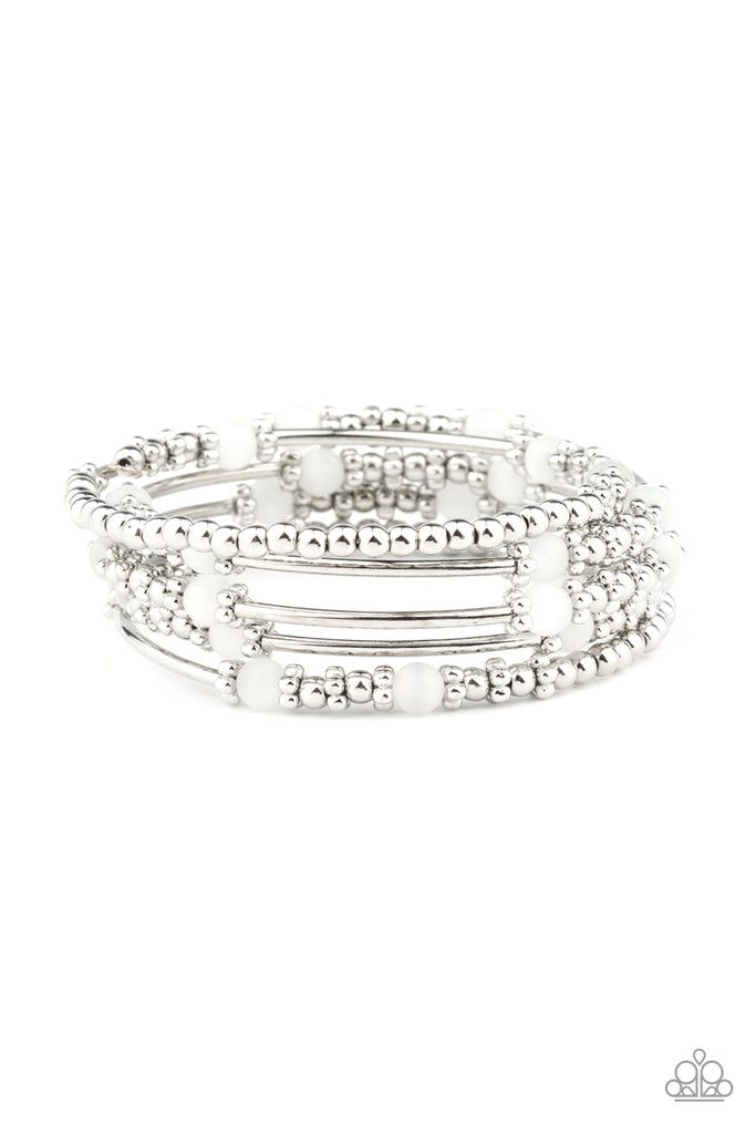 A collection of silver beads, glowing white cat's eye stones, and studded silver accents are threaded along a coiled wire, creating a colorful infinity wrap style bracelet around the wrist.