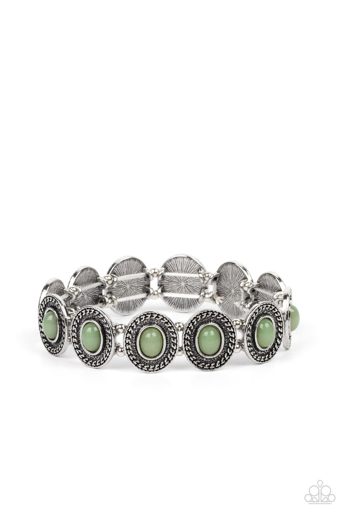 Separated by pairs of dainty silver beads, dewy Basil beads are nestled inside textured silver oval frames that are threaded along stretchy bands around the wrist for a whimsical pop of color.