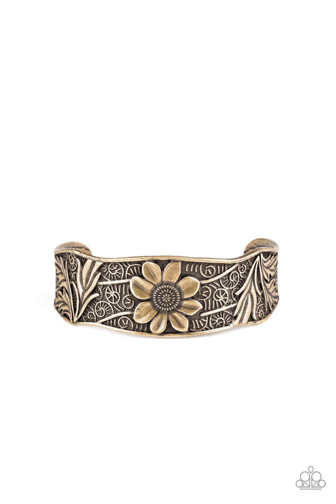 The front of an asymmetrical brass cuff is stamped and embossed in lacy vines and a leafy floral pattern for a whimsical fashion.