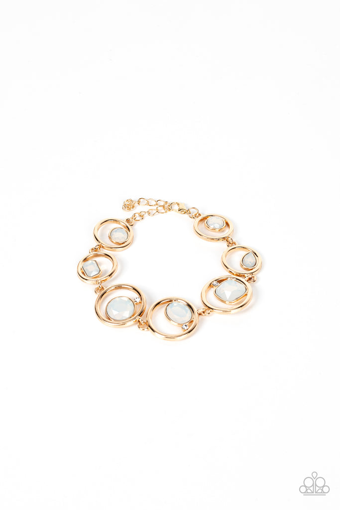 Sporadically infused with dainty white rhinestones, a glittery collection of round, teardrop, and emerald cut opal rhinestones haphazardly adorn the centers of interlocking gold hoops around the wrist for a mesmerizing finish. Features an adjustable clasp closure.