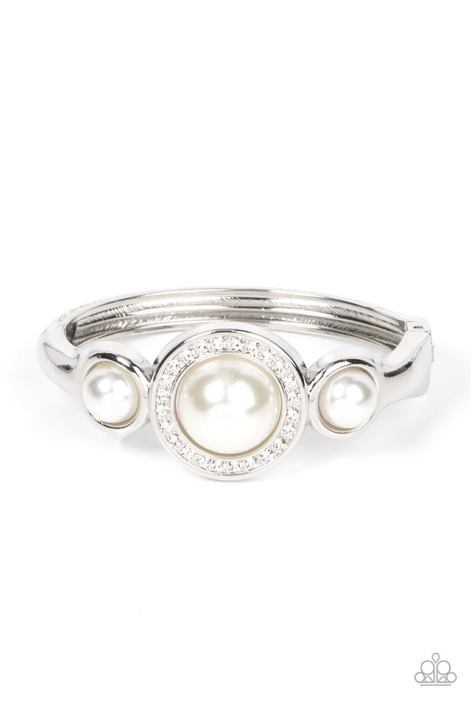 Encircled in a glitzy ring of glassy white rhinestones, an oversized white pearl is flanked by a pair of bubbly white pearl fittings atop a classic silver bangle-like bracelet for a timeless twist. Features a hinged closure.