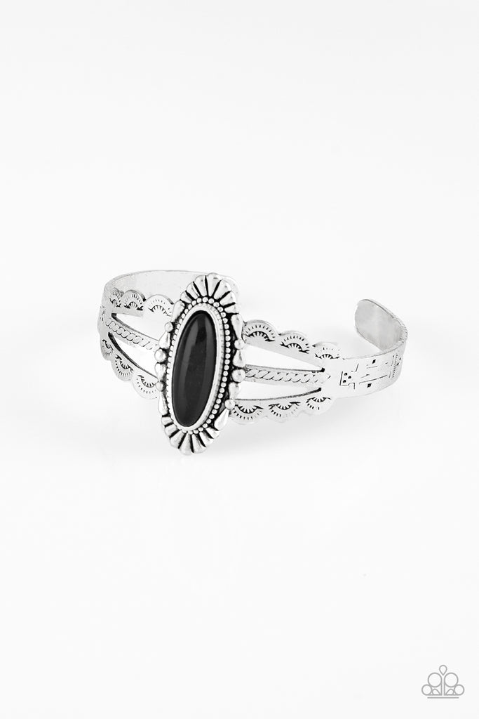 Stamped in tribal inspired patterns, a scalloped silver cuff curls around the wrist. A refreshing black stone is pressed into the center of the cuff, creating a whimsical centerpiece.