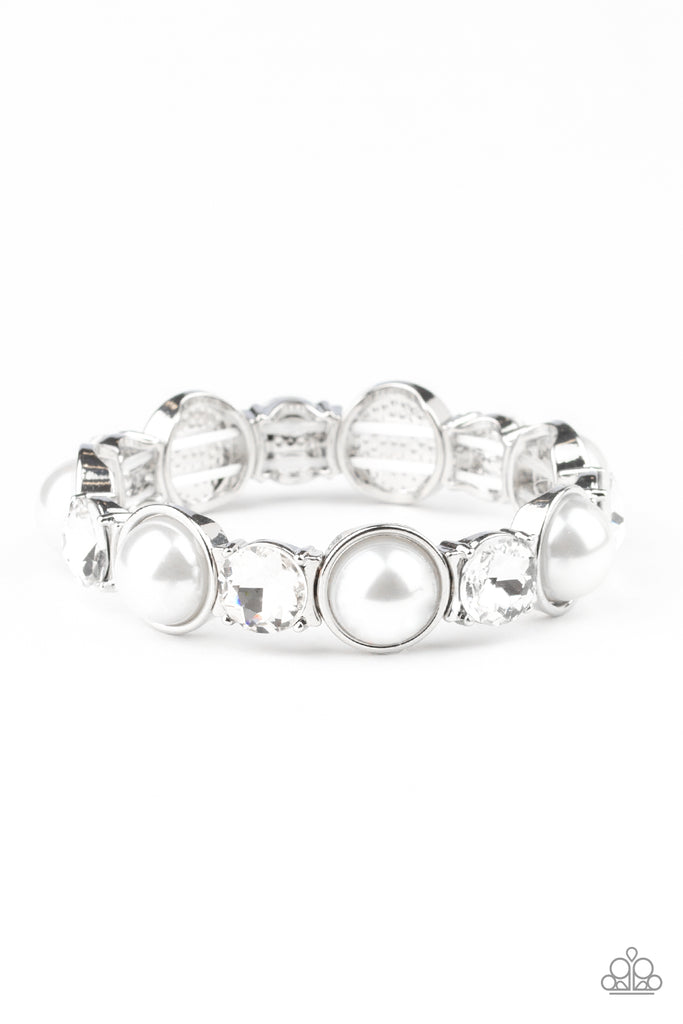 Featuring sleek silver fittings, bubbly white pearls and oversized white rhinestones are delicately threaded along stretchy bands around the wrist for a refined flair.