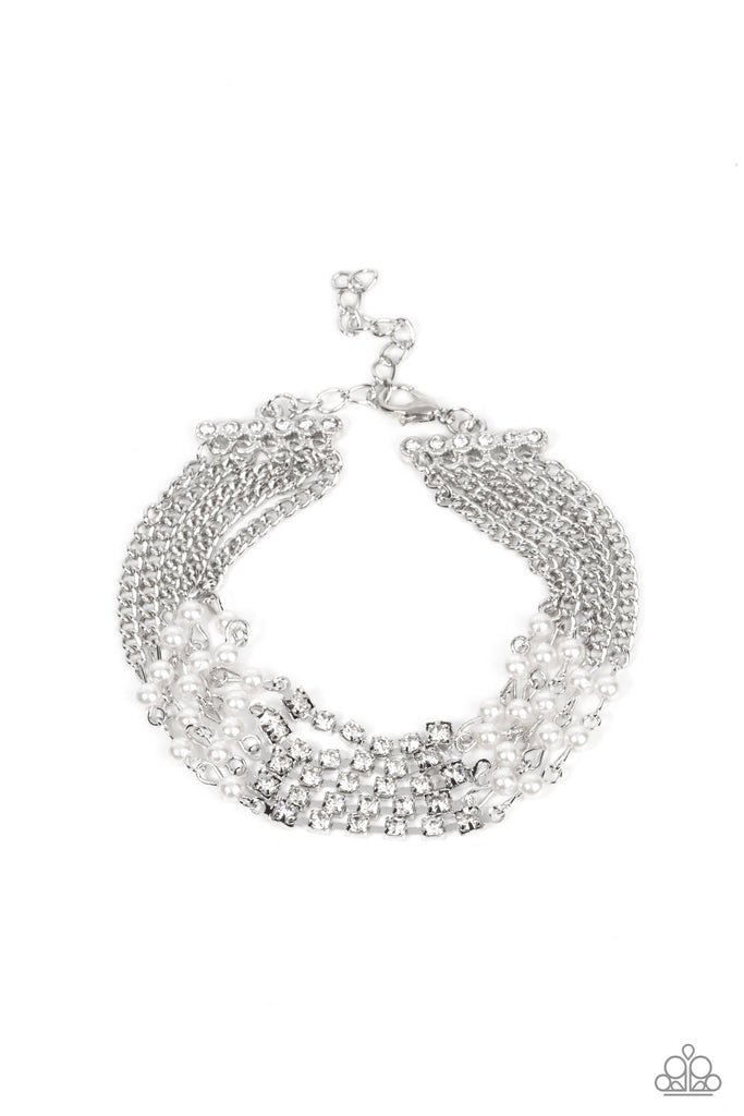 Held together with white rhinestone encrusted silver fittings, sections of dainty white pearls and glassy white rhinestones delicately connect to classic silver chains around the wrist for a timelessly layered look around the wrist. Features an adjustable clasp closure.