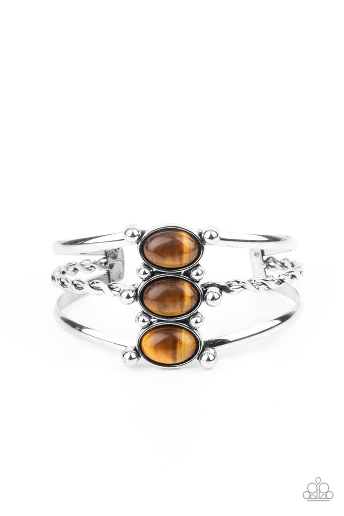 Featuring silver studded fittings, an earthy trio of oval tiger's eye stones adorn the center of an ornately layered silver cuff for a seasonal finish.