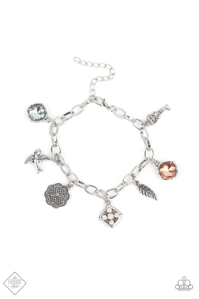 Multicolored gems, a floral medallion, a bird in flight, and a fluttering feather coalesce into a whimsical charm bracelet as they dangle from a delicate silver chain around the wrist. Features an adjustable clasp closure.