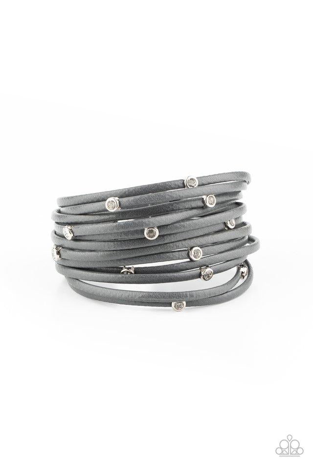 Dotted with glassy white rhinestones, strands of gray leather cording are strung between two silver fittings around the wrist for a fabulously layered finish. Features a magnetic closure.