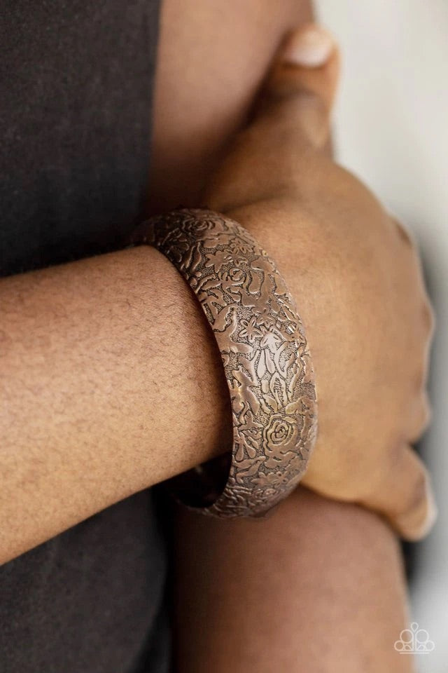 Brushed in an antiqued finish, a rosy floral pattern is embossed across a thick copper bangle for a seasonal flair.