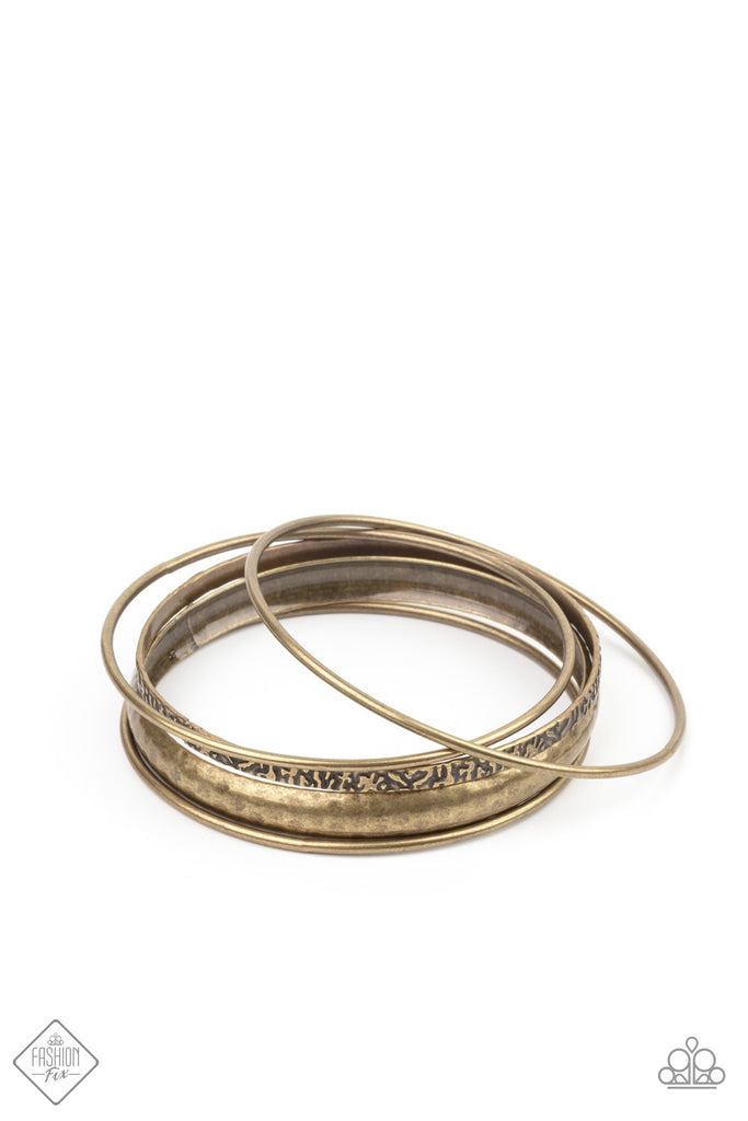 A mismatched collection of smooth, hammered, and textured brass bangles stack up the wrist for an edgy, industrial effect.