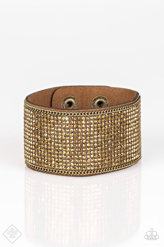 Paparazzi Glitter Gossip Brass Shimmer Wrap Urban Bracelet Fashion Fix Row after row of glittery aurum rhinestones are encrusted along a thick brown suede band, creating a blinding shimmer across the wrist. Features an adjustable snap closure Sold as one individual bracelet.