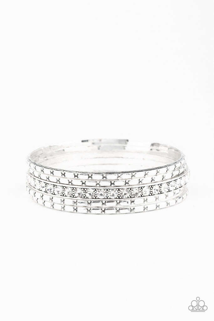 A single white rhinestone encrusted bangle joins four textured silver bangles, creating an edgy stack of shimmer across the wrist.