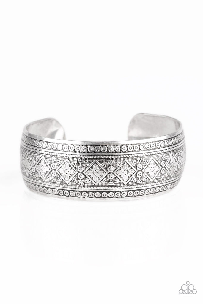 Embossed in whimsical floral patterns, an ornate silver cuff curls around the wrist for a seasonal look.