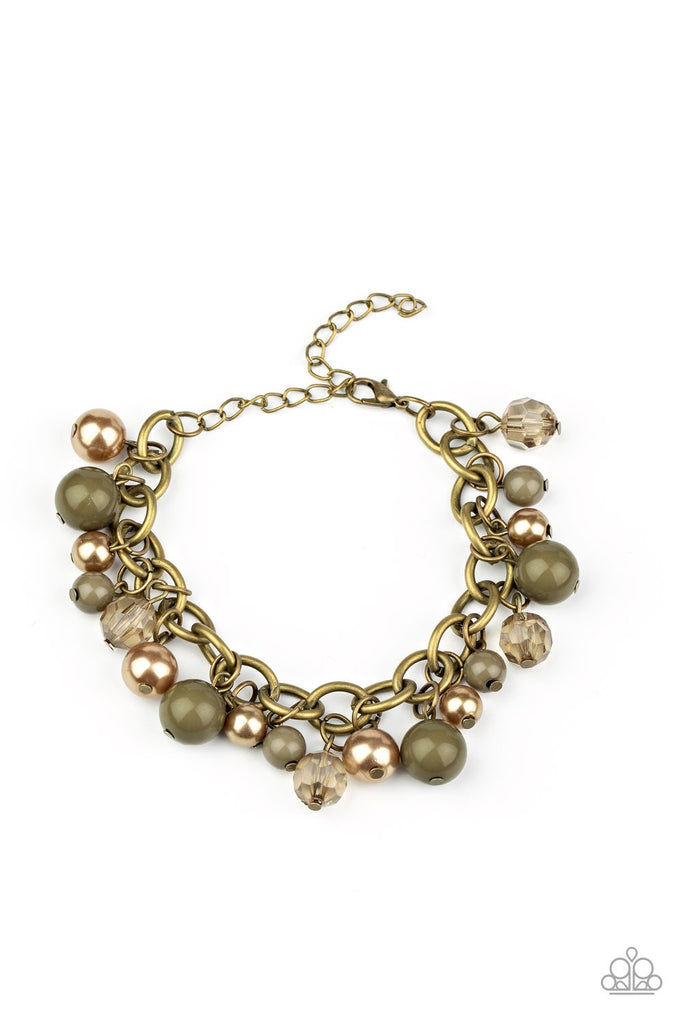 Pearly brass, polished green, and glittery crystal-like beads swing from a bold brass chain, creating a refined fringe around the wrist. Features an adjustable clasp closure.
