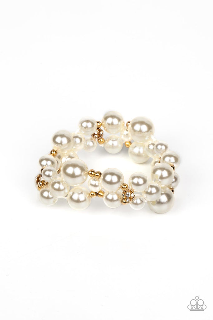 A bubbly collection of white pearls, dainty gold beads, and white rhinestone encrusted accents are threaded along braided stretchy bands around the wrist, resulting in an elegant effervescence.