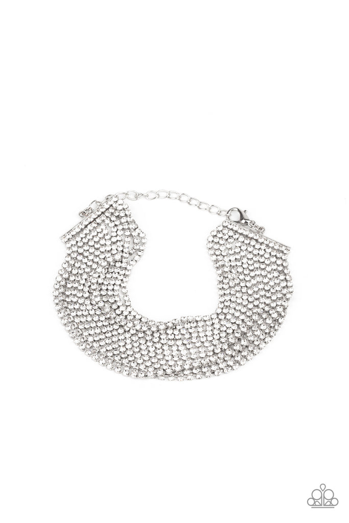 Strung between two silver fittings, sparkly strand after sparkly strand of glittery white rhinestones layer around the wrist, creating a glamorous statement piece. Features an adjustable clasp closure.
