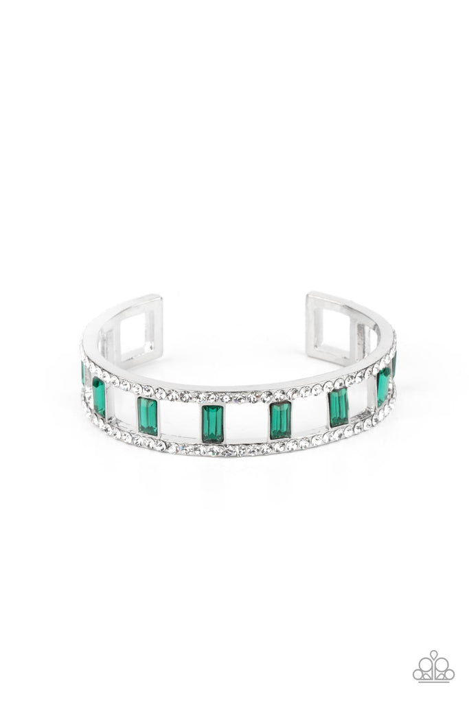 Bands of glittery white rhinestones overlaid on silver frames create an airy channel-like framework. Elegant baguette style cut green gems, connected to the glittery framework, circle around the wrist for a romantically decadent cuff bracelet.
