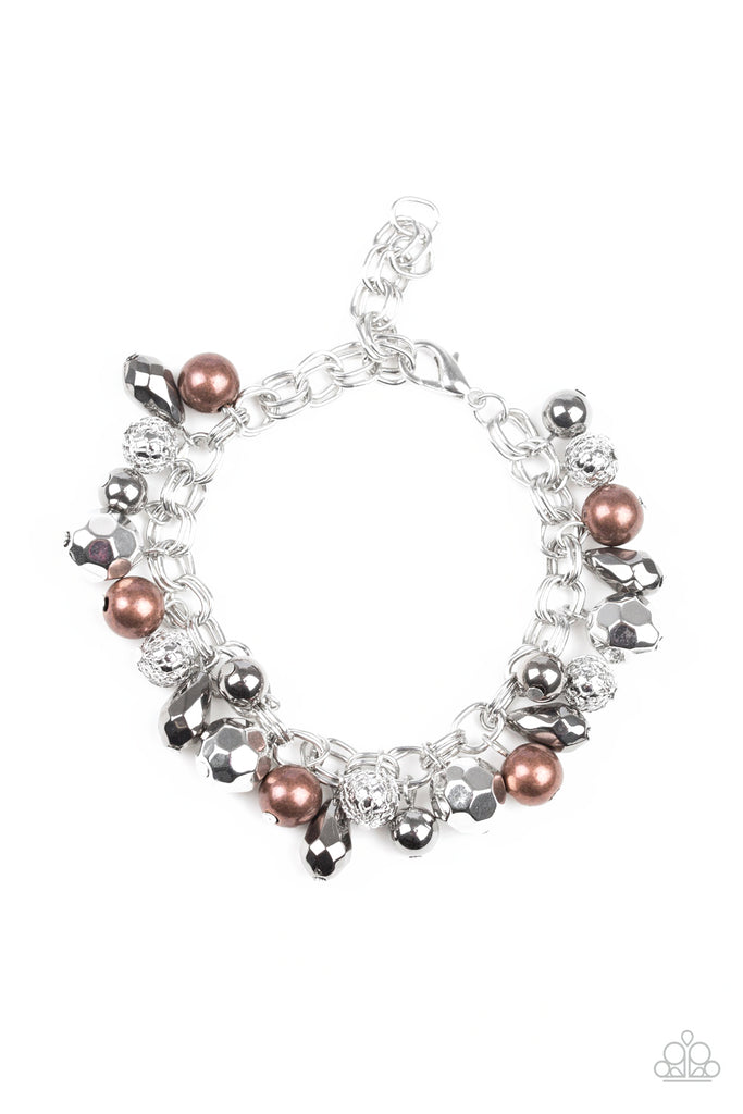 Featuring shiny, faceted, and mesh finishes, mismatched copper, gunmetal, and silver beads trickle from the wrist for an edgy industrial look. Features an adjustable clasp closure.