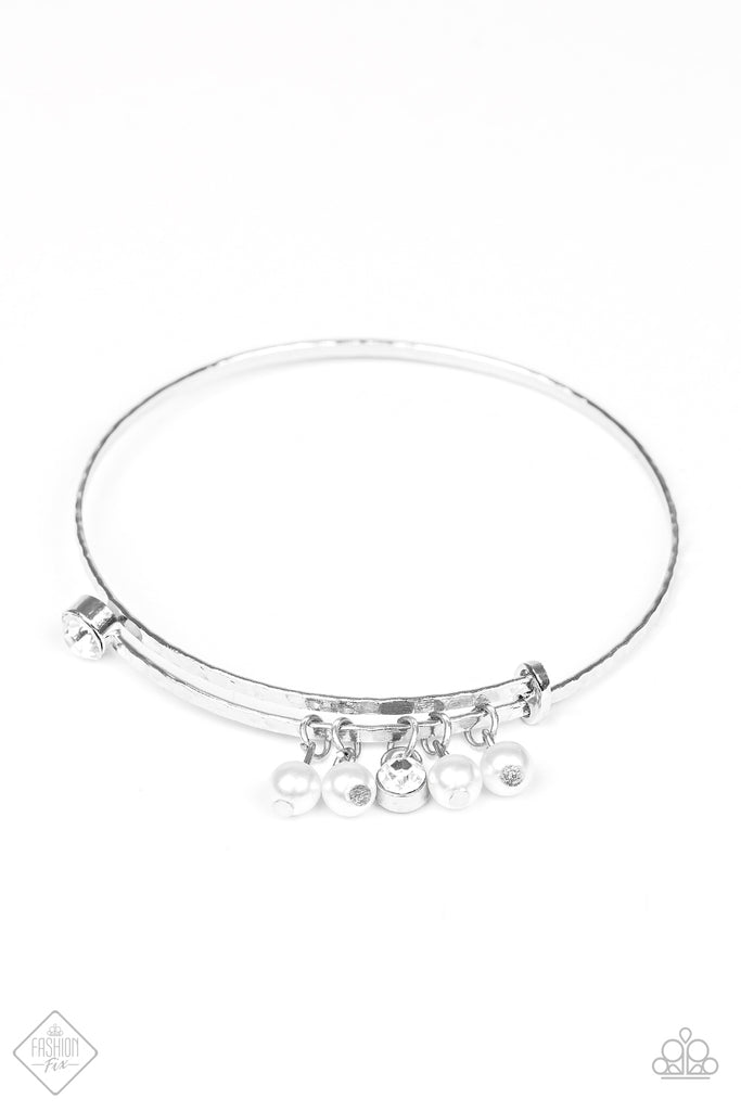 Delicately hammered in shimmery textures, a glistening silver bar coils around the wrist, creating an adjustable bangle. Classic white pearls and glittery white rhinestones slide along the bar, coming to a stop at a dramatic white rhinestone for a refined finish.