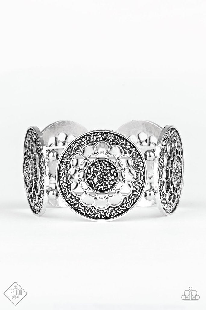 Separated by pairs of dainty silver beads, silver floral discs are threaded along stretchy bands that wrap around the wrist in a whimsical finish. Sold as one individual bracelet.