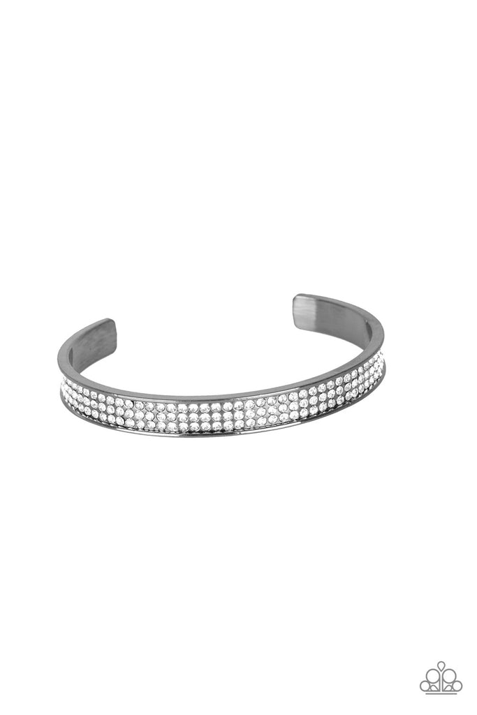 A skinny gunmetal cuff is encrusted in row after row of glassy white rhinestones, creating blinding shimmer across the wrist.