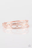 Featuring serrated textures, mismatched rose gold bangles stack across the wrist for a casual look.