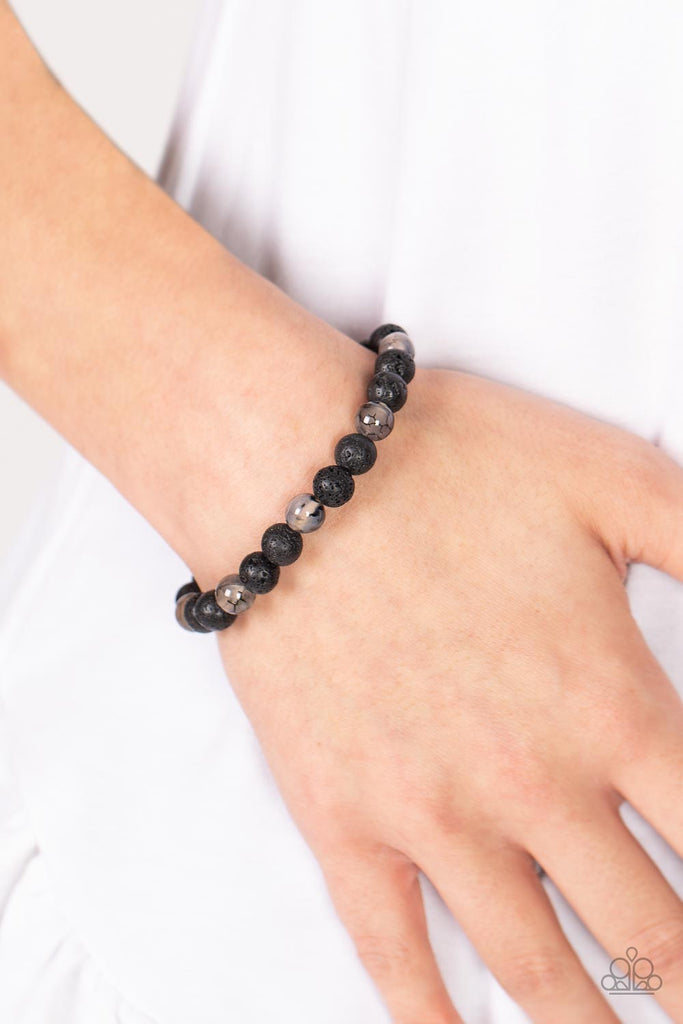 Crackling white beads alternate with pairs of black lava rock beads along stretchy bands around the wrist, creating a colorfully earthy look.